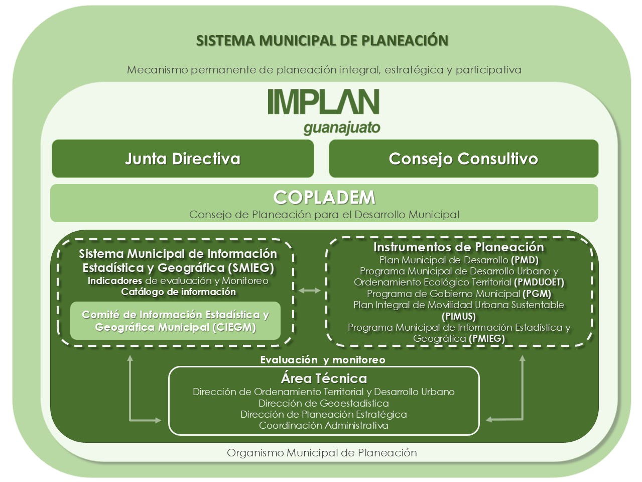 El Sistema Municipal de planeación se conforma por cuatro pilares interrelacionados, que impulsan el ejercicio de planeación y desarrollo del municipio. El primero es el Instituto Municipal de Planeación de Guanajuato, entidad paramunicipal encargada de coordinar el Sistema Municipal de planeación, conformado a su vez, por la Junta Directiva máxima autoridad del Instituto y el Consejo Consultivo ambos conforman el segundo pilar.